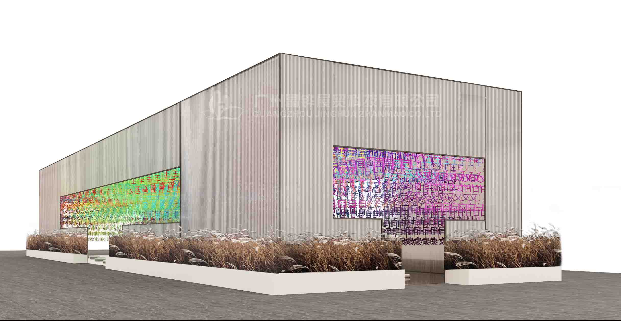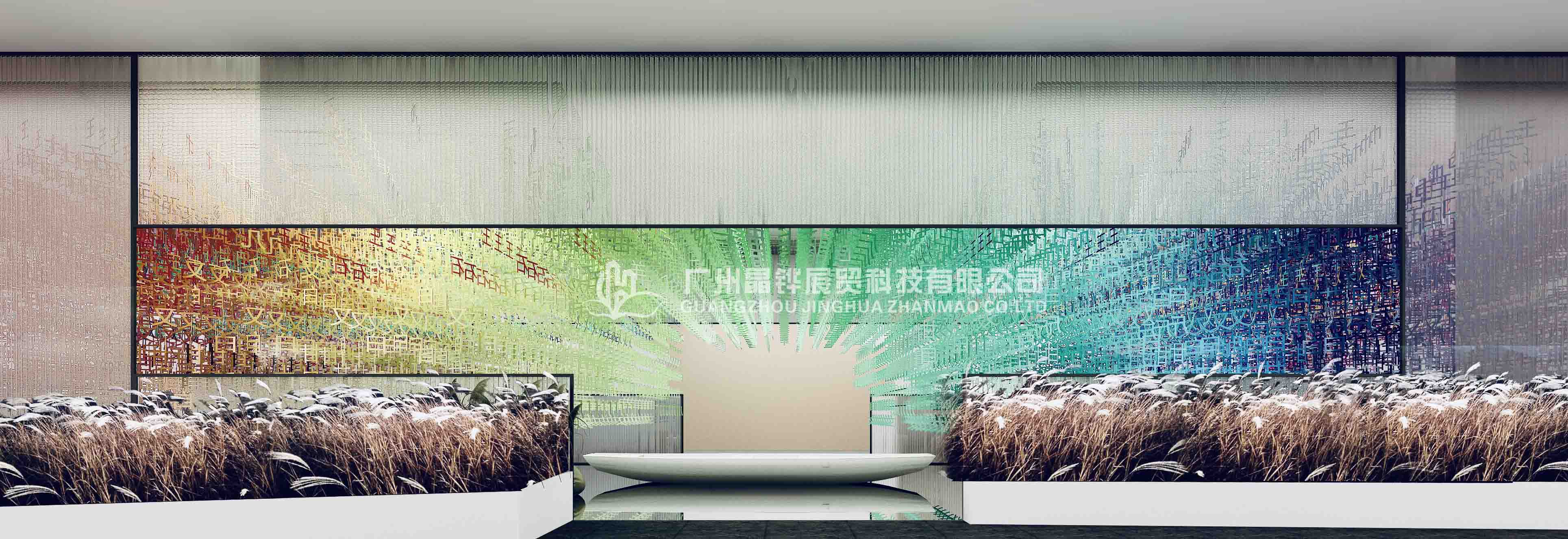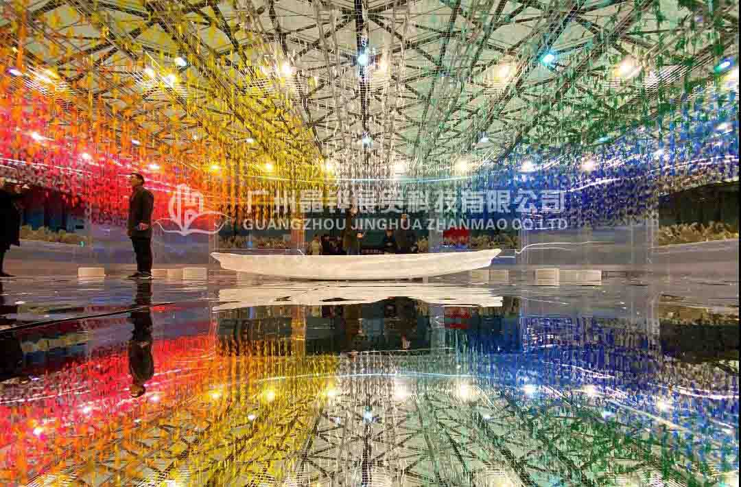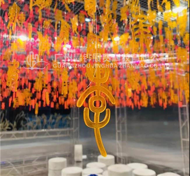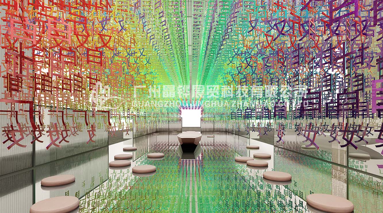 3萬個不同色調(diào)的《百家姓》篆體字懸掛在展館頂部,在燈光的照耀下,閃爍著冷暖漸進(jìn)色調(diào)的光芒。鏡面似的地板如流水漣漪,一葉扁舟,舟上美女撫琴,零落幾席蒲團(tuán),四周圍繞著婆娑的蘆葦……文字、文化、藝術(shù)與生活之源完美融合,江南水鄉(xiāng)元素表現(xiàn)得淋漓盡致。
