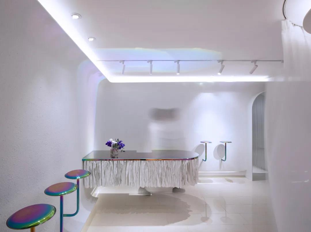 Recovery專注于使用高科技光療法護理皮膚,我們主要以這項技術為出發點深化美容院的設計概念和美感。與之相對的是光滑的拋光墻面,將訪客的目光從入口處被吸引至光療室的私人空間。我們創作了許多模型來達到垂直褶皺層的效果,并采用了帆船制造中常見的特殊節點技術。精致的接待柜臺從墻上懸垂而出,輕盈而精巧。柔和、輕薄、半透明的門簾遮擋住內部的使用者,防止外面路過的人朝里面看。在光療室走廊盡頭的鏡子給人留下深刻的印象,同時也給人一種錯覺,即每個房間不是一個房間而是裝飾精美的隔墻,開門的時候垂直覆蓋層相互摩擦,沙沙作響,令人享受的噪音打破了往日的平靜,并且在打開這些大門的同時內心會產生一種儀式感。
